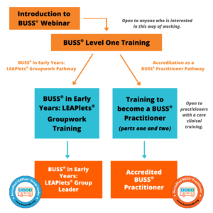 Training is available for individuals and organisations. It’s anticipated that more people will train at Introduction and Level One stages than will progress to become Accredited BUSS® Practitioners. Bespoke training and ongoing work can also be offered for organisations with different requirements (e.g. education). The Pathway to becoming an Accredited BUSS® Practitioner and the Pathway to becoming a BUSS® in Early Years LEAPlets® Group Leader can be seen below. To download it, and to see the professional requirements to attend each course click here.